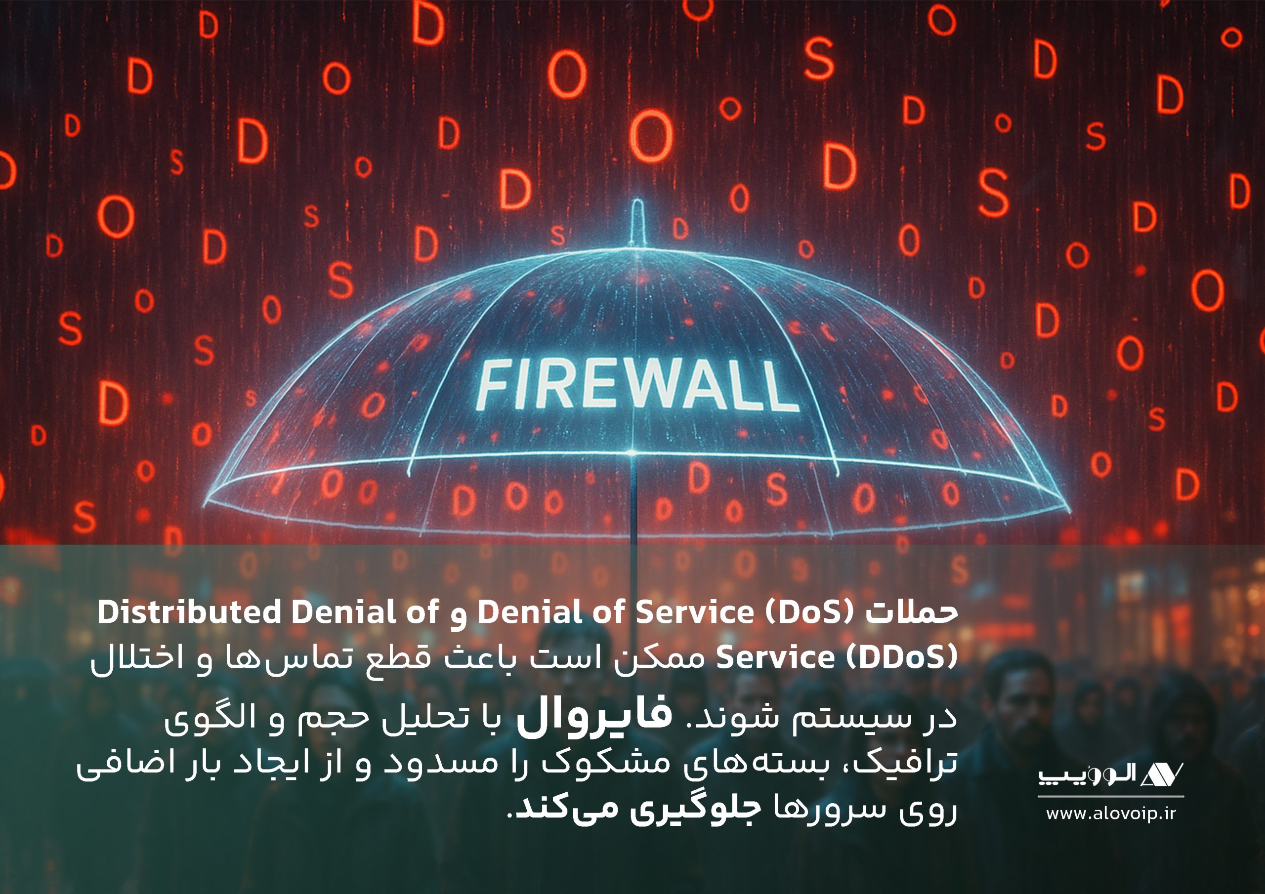 حملات Denial of Service (DoS) و Distributed Denial of Service (DDoS) ممکن است باعث قطع تماسها و اختلال در سیستم شوند. فایروال با تحلیل حجم و الگوی ترافیک، بستههای مشکوک را مسدود و از ایجاد بار اضافی روی سرورها جلوگیری میکند.