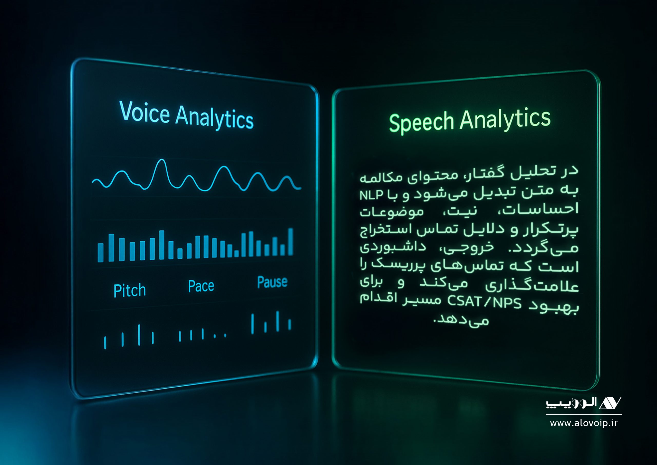 - Speech Analytics علاوه بر جنبههای صوتی، به محتوای کلمات و معنای جملات هم توجه میکند.